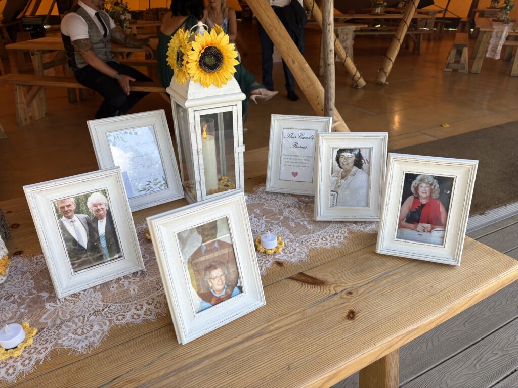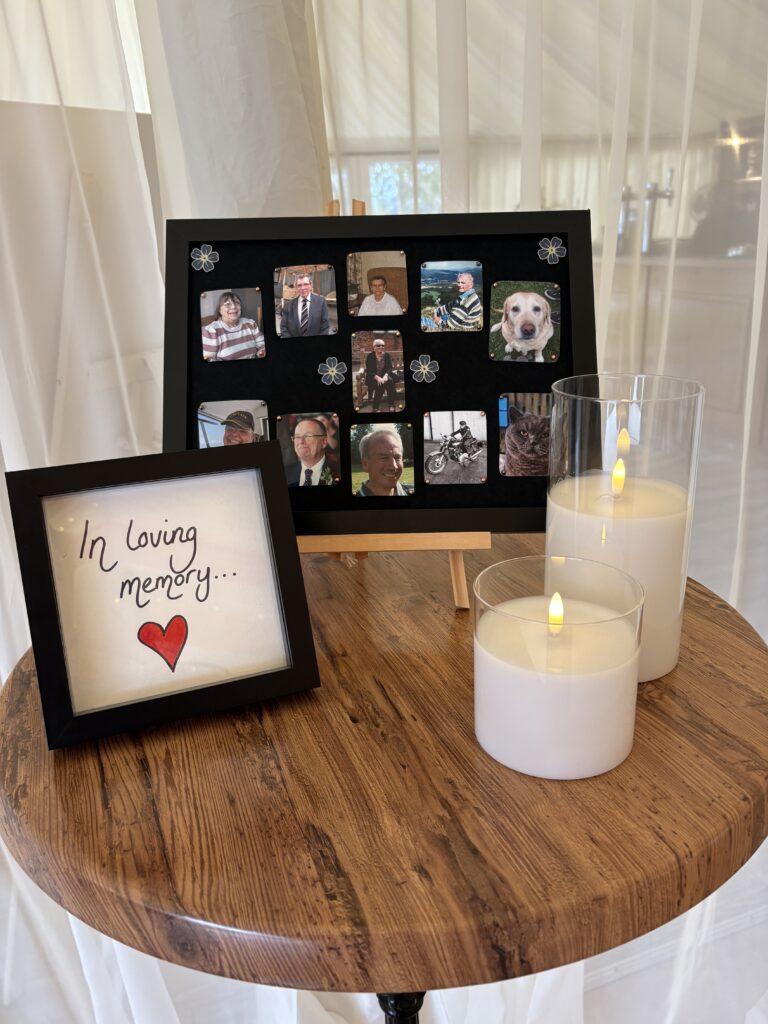 A framed photo, a favourite item, or a small candle can create a serene space that says, “You are here with us in spirit.” Some couples include a chair with a flower placed on it to symbolise a loved one’s ongoing place in the family.